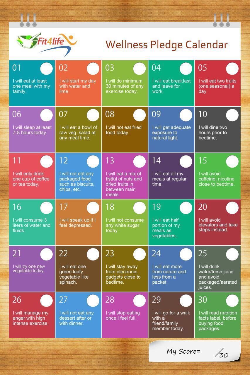 Eat fresh and wholesome food and follow healthy eating habits. Food should be had in a peaceful and calm environment. Healthy eating means eating a variety of foods that give you the nutrients. You need to maintain your health, feel good, and have energy. Wellness Pledge Calendar